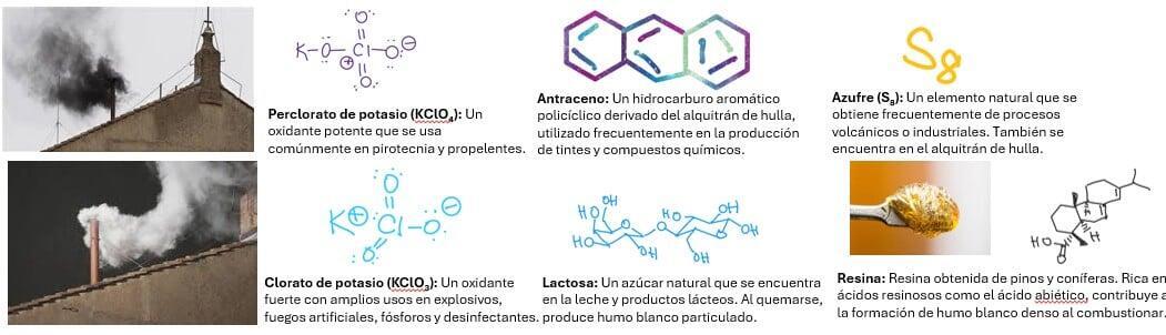 Humo blanco: La mezcla de clorato de potasio, lactosa y resina genera partículas finas y vapor de agua. La resina, rica en compuestos con oxígeno, favorece la formación de pequeñas gotas y partículas que dispersan la luz, dándole al humo una apariencia blanca.
